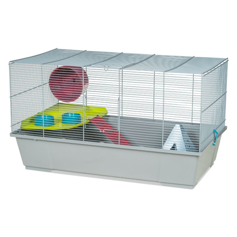 Producto ECO. Esta jaula grande pertenece a la colección Hamster XL, es una jaula muy completa, es ideal para hámster Ruso y Roborosky, gracias a una malla con una separación entre alambres de 7mm. Tiene 2 niveles e incluye escalera, casita tipi metálica, noria y comederos. Fabricada en España utilizando alambre recubierto con pintura epoxi sin plomo y usando solo plástico polipropileno reciclado, materias primas no tóxicas para tu mascota. Disponemos de piezas de recambio y accesorios para completar la jaula. Para mejorar la salud y confort de la mascota, VOLTREGA rECOmienda la limpieza de la jaula con productos especializados una vez por semana, preferiblemente con Zerobakter. Voltrega también te ofrece muchos complementos para tu jaula así como juguetes y snacks para tu mascota.